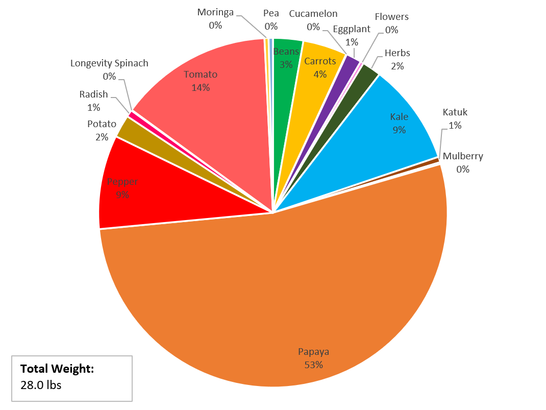 Early this year, Tyler and I had the idea to start recording the weights of everything we harvested. Unfortunately, we didn’t think of this until March 27, so the data doesn’t account for about three months worth. Nor does it account for garden snacks (leaves or one-off berries munched while strolling around the garden looking at plants). Nonetheless, the graph below depicts a great success! We harvested a total of 28 pounds of food! Nearly half of that was papaya, with peppers, tomatoes, and kale also making up significant portions of that.